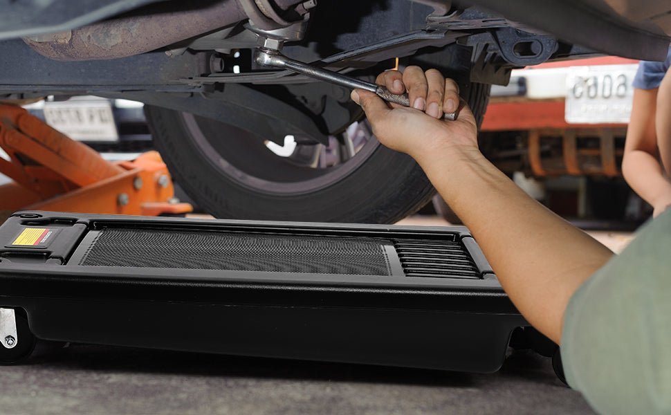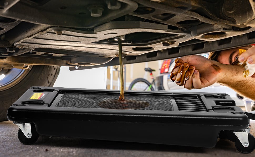 • ??[CASTER DESIGN]- oil drain pan features four caster wheels (two fixed and two free), that allow for easy mobility and positioning, making oil-changing a breeze. The fixed wheels provide stability and support, while the free wheels allow for smooth movement around the garage or workshop floor.