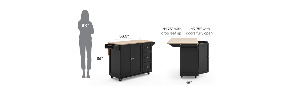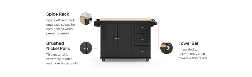 Bring both function and style to your kitchen with this understated island, the perfect anchor for your arrangement. Its clean lines and wood top pair together to give this design a traditional look that blends effortlessly into any aesthetic. Use its ample storage space to stow kitchen essentials including dry ingredients, flatware, spices, and more. Its solid rubberwood top is perfect for prepping meals or displaying a vase of romantic roses. Use its drop-leaf function to craft a breakfast bar in your kitchen or to maximize your prep space. With its wheeled design and towel rack, this versatile design is a must-have addition to your kitchen ensemble.
